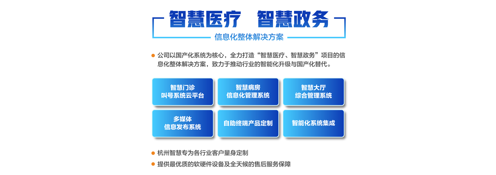 杭州智慧科技有限公司初創(chuàng)于2003年,總部位于重要的電子商務(wù)中心中國(guó)杭州公司主營(yíng)業(yè)務(wù)有:智慧分診叫號(hào)系統(tǒng)、智慧病房醫(yī)護(hù)對(duì)講系統(tǒng)、智慧大廳綜合管理系統(tǒng)、智慧政務(wù)管理系統(tǒng)、智慧多媒體信息發(fā)布系統(tǒng)、導(dǎo)診系統(tǒng)及各自助終端產(chǎn)品定制。專(zhuān)為各行業(yè)客戶量身定制。公司已有20余年行業(yè)經(jīng)驗(yàn)沉淀積累,擁有優(yōu)秀的產(chǎn)品外觀設(shè)計(jì)師和各類(lèi)中高級(jí)專(zhuān)業(yè)技術(shù)工程師,確保所研發(fā)的產(chǎn)品具有行業(yè)領(lǐng)先的外觀及可靠的技術(shù)性能。并擁有權(quán)威部門(mén)頒發(fā)的各類(lèi)知識(shí)產(chǎn)權(quán)及專(zhuān)利證書(shū),30多項(xiàng)資質(zhì)證書(shū)、800多個(gè)合作伙伴、2000多個(gè)項(xiàng)目成功案例經(jīng)驗(yàn)。 智慧產(chǎn)品已遍及全國(guó)各醫(yī)療、政務(wù)、金融、通訊、公安、工商、稅務(wù)等行業(yè),形成以“立足杭州、輻射長(zhǎng)三角、拓展全國(guó)”的戰(zhàn)略發(fā)展格局,產(chǎn)品經(jīng)過(guò)歷年不斷創(chuàng)新,形成專(zhuān)業(yè)化、平臺(tái)化,致力于成為智慧產(chǎn)品的領(lǐng)軍企業(yè)。 公司建立了完善的技術(shù)培訓(xùn)及售后服務(wù)中心,并設(shè)24小時(shí)熱線咨詢(xún)電話解答用戶反饋的問(wèn)題。同時(shí)應(yīng)客戶要求定期派技術(shù)人員到 全國(guó)各地進(jìn)行技術(shù)指導(dǎo)輔助用戶正確使用智慧產(chǎn)品并能獨(dú)立安裝、調(diào)試、日常維護(hù)等工作。提供最優(yōu)質(zhì)的設(shè)備及全天候的售后服務(wù)保障,智慧永恒不變的服務(wù)宗旨——致力于客戶的滿意與成功!...